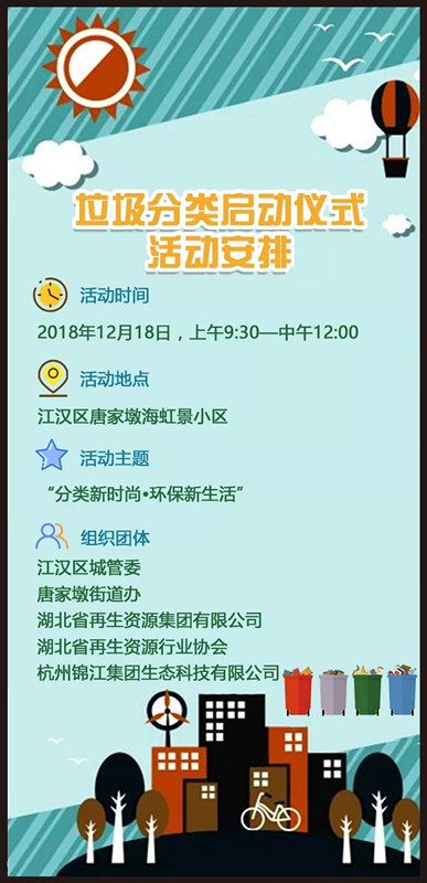 湖北省再生資源集團(tuán)有限公司*湖北省再生資源行業(yè)協(xié)會(huì)*杭州錦江集團(tuán)生態(tài)科技有限公司*江漢區(qū)城市綜合管理委員會(huì)*唐家墩街道*武漢交發(fā)物業(yè)管理有限公司,共同攜手,深入武漢,助力江漢,開(kāi)啟垃圾分類之旅!