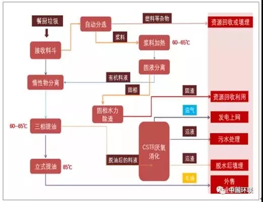 餐廚垃圾的特點包括有機物含量高,含水率高,易腐爛變質(zhì),易發(fā)酵、發(fā)臭,主要是采用厭氧消化、好氧堆肥和飼料化工藝等生物法進行處理。其中厭氧消化工藝能最大化回收油脂,無害化程度高,并能夠充分地對餐廚垃圾中的有機物進行資源化回收和利用,已經(jīng)有超過70%的餐廚垃圾處理項目使用這條技術(shù)路線,是現(xiàn)階段的主流工藝路線。