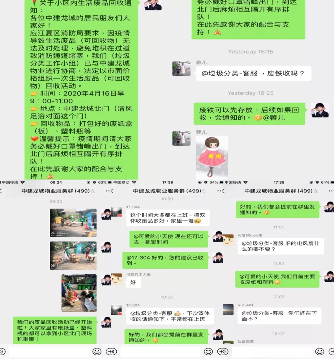 活動(dòng)開始前,在“中建龍城物業(yè)群”發(fā)布回收通知;活動(dòng)開始時(shí),居民們拿著家里近段時(shí)間的“存貨”排起了長(zhǎng)龍,每個(gè)人都自覺間隔1米以上,耐心地等待著。