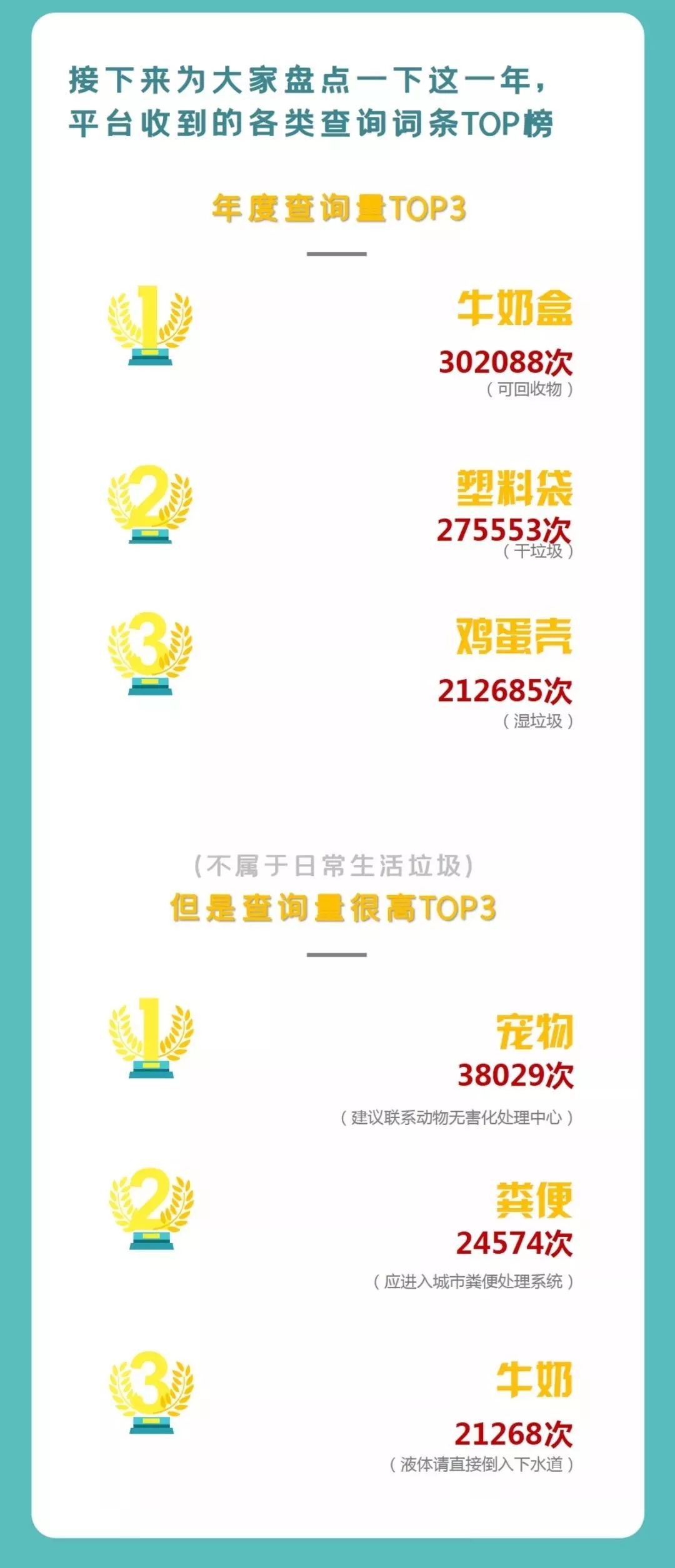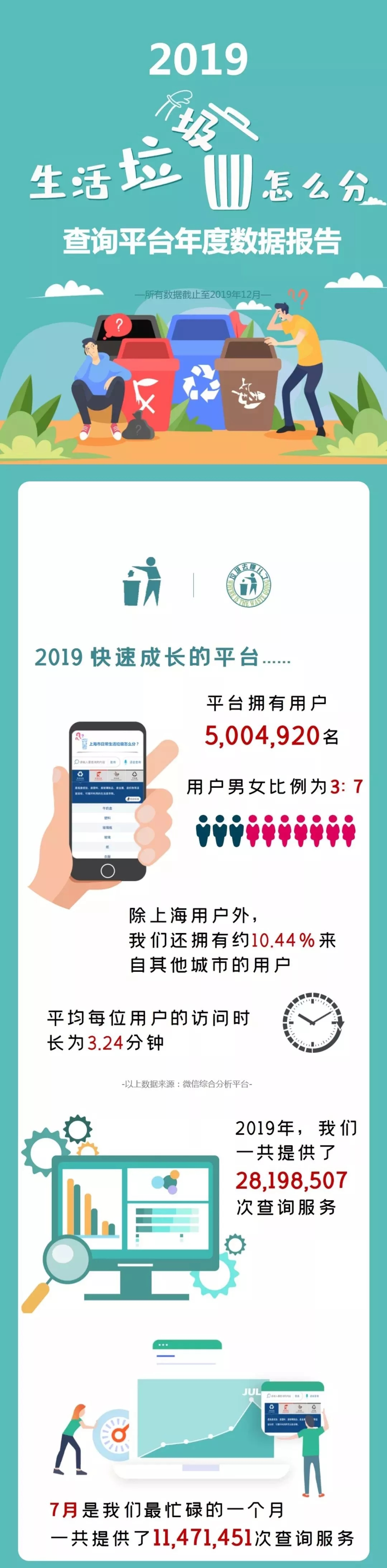 市綠化市容局說,自2019年7月1日《上海市生活垃圾管理?xiàng)l例》實(shí)施以來,使用“上海發(fā)布”市政大廳“垃圾分類查詢”功能和“垃圾分類查詢小程序”的用戶已超500萬名,平均每位用戶訪問時(shí)長為3.24分鐘。在各類查詢詞條中,年度查詢量前三的生活垃圾分別為牛奶盒、塑料袋和雞蛋殼。詳見↓